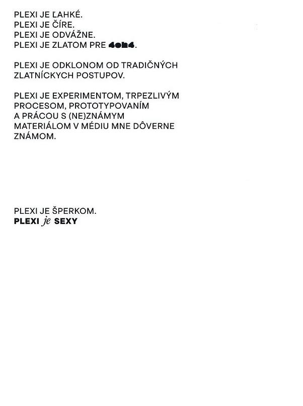 V kolekcii Plexi je sexy skúmam hranice alternatívneho materiálu v šperku. Cielene sa odkláňam od tradičných zlatníckych materiálov a postupov – smerom k experimentu, trpezlivému procesu, prototypovaniu a práci s (ne)známym materiálom v médiu, ktoré je mi dôverne známe. Týmto spôsobom chcem poukázať na to, že hodnota šperku nespočíva len v materiáli, ale predovšetkým v kreativite, originalite a šikovnosti umelca.