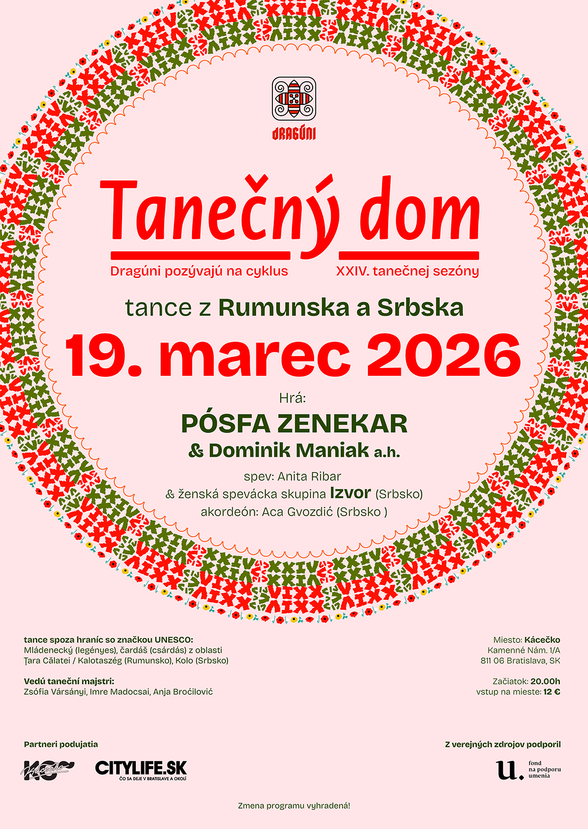 Dragúni pozývajú v rámci XXIV. sezóny na Novoročnú tancovačku - rozprúdia Vás rómske tance z Moldavy nad Bodvou a temperamentné tance a spevy z Čierneho Balogu, ktoré sa budete môcť naučiť od profesionálnych tanečných majstrov.