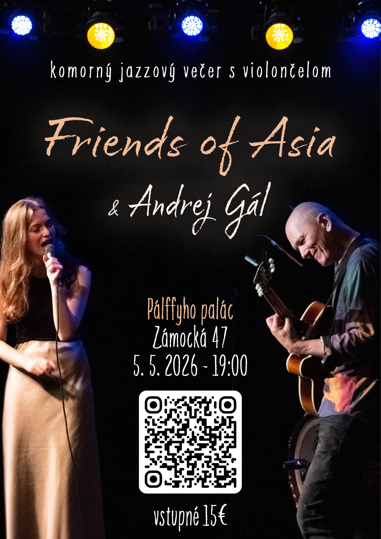 Friends of Asia je komorné duo, ktoré spája jazz, soul a folk s poetickou improvizáciou a osobnými príbehmi. Ich hudba vytvára atmosféru tichej konverzácie medzi hlasom a gitarou. Tentokrát tento intímny svet obohatia o ďalší rozmer – majstrovské violončelo Andreja Gála, ktorý patrí k najvýraznejším slovenským interpretom klasickej a komornej hudby.
