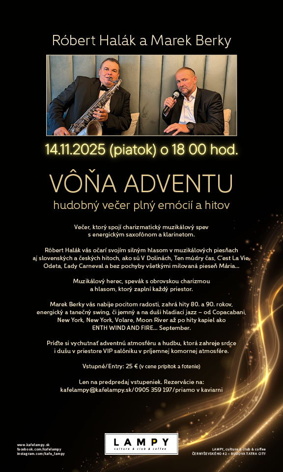Príďte si vychutnať adventnú atmosféru a hudbu, ktorá zahreje srdce i dušu v priestore VIP salóniku v príjemnej komornej atmosfére.