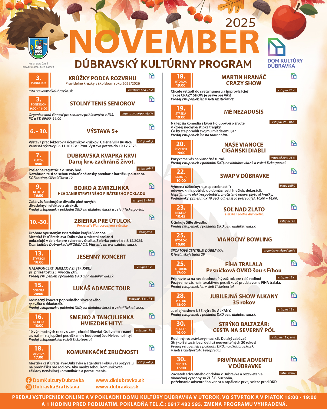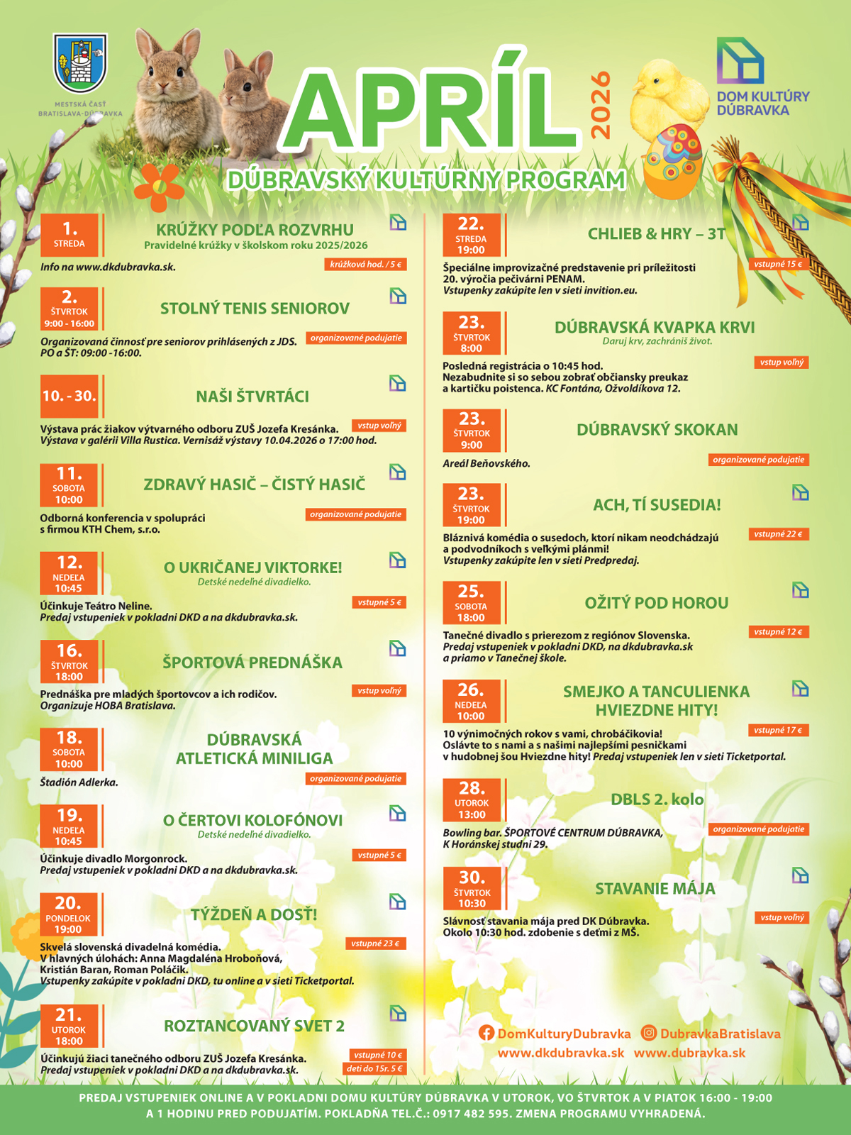 Dom kultúry Dúbravka organizuje podujatia miestneho aj medzinárodného významu, divadelné a filmové predstavenia (nachádza sa tu Kino Igric), koncerty, tanečné zábavy, plesy, ľudové veselice, výstavy.mapa: Google Maps