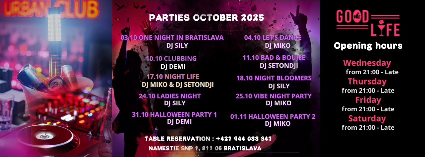 Good Life je jedinečný nočný klub v Starom meste, na námestí SNP 1. Otvorený je od stredy do soboty, cez víkend ponúka parties zamerané na urban music - latino, hiphop, afrobeats, občasne aj oldies party.mapa: Google Maps