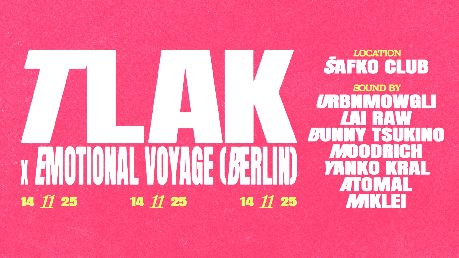 Berlínsky label Emotional Voyage smeruje po veľkom úspechu na tohtoročnom Grape Festivale opäť na Slovensko - do Šafko klubu. Ak máte chuť objavovať novú kvalitnú hudbu alebo "iba ísť vypustiť ventil" na tanečný parket - DJs z EV toto určite splnia svojim svojským mixom žánrov ako BreakBeat, Acid, House, Trance či Lo Fi...