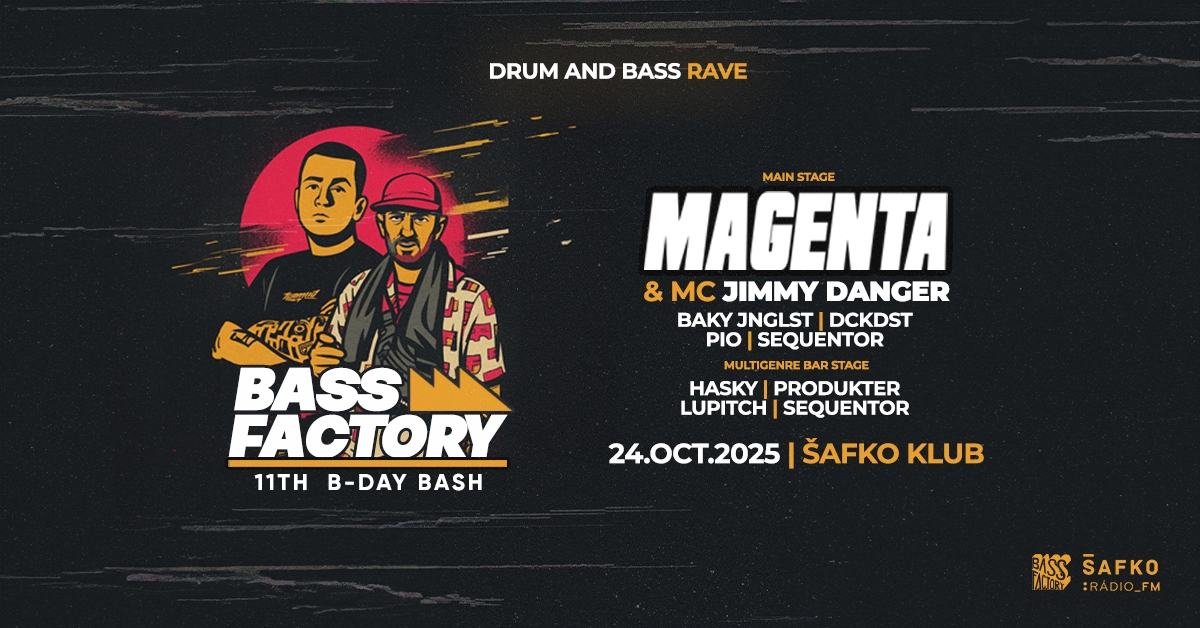 Bass Factory oslavuje 11. narodeniny v klube Šafko. Dva stage, špeciálny hosť a noc, na ktorú len tak nezabudneš.21:00 |