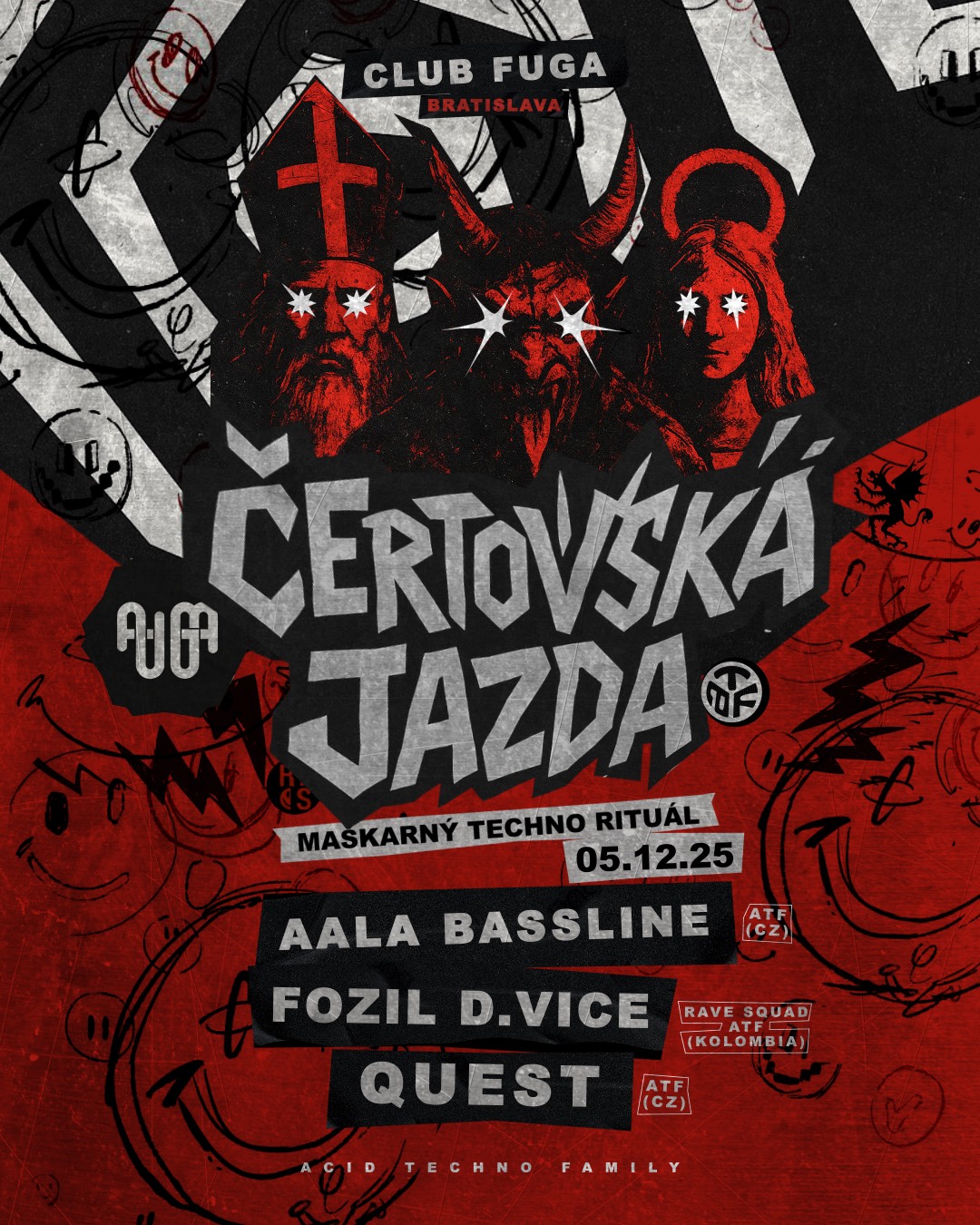 Maškarná čertovská jazda v podaní acid techno family a kolumbijského hosťa DJa Fozil.D.Vice. Hrať sa bude od techna až po tekno.