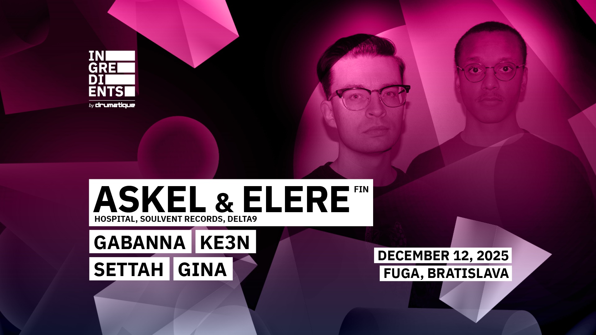 Drum&bass vo Fuge nie je žiadnou novinkou. Pod hlavičkou DJ dvojice Gabanna a Ke3n z Drumatique crew sa tu už predstavili viaceré mená zo svetovej scény lámaných beatov. S hľadáčikom stále nasmerovaným do temných a atmosferických vôd drum&bassu pokračuje po skoro roku ďalšou edíciou párty Ingredients.