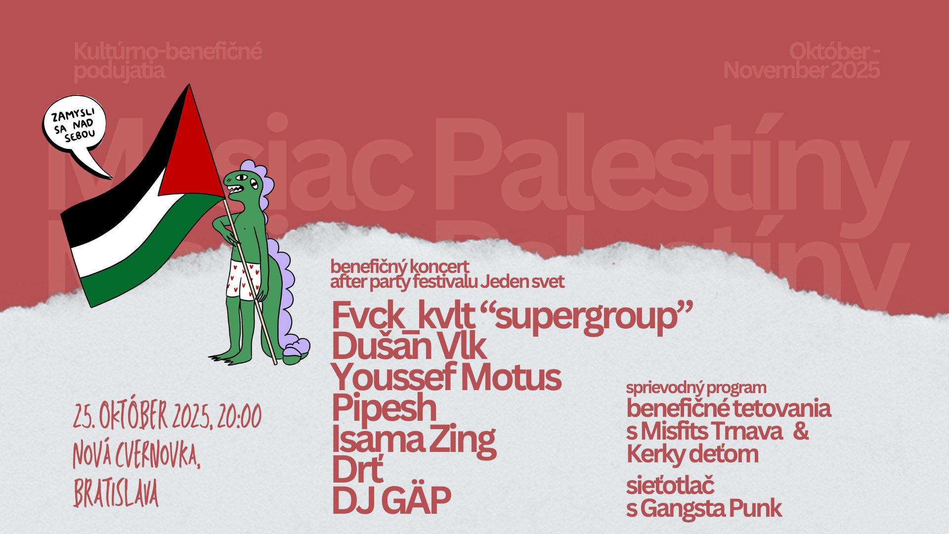 Na pódiu sa predstavia Fvck_kvlt “supergroup”, Dušan Vlk, Youssef Motus (Egypt), Pipesh, Isama Zing, Drť a DJ GÄP. Okrem hudby prinesie večer aj priestor pre tvorivosť a solidaritu. V spolupráci s Misfits Tattooshop & Kerky deťom sa uskutoční benefičné tetovanie, počas ktorého si budú môcť návštevníci nechať vytetovať malé motívy s palestínskou tematikou - symboly odporu, nádeje a slobody. Výťažok poputuje na pomoc ľuďom v Gaze.