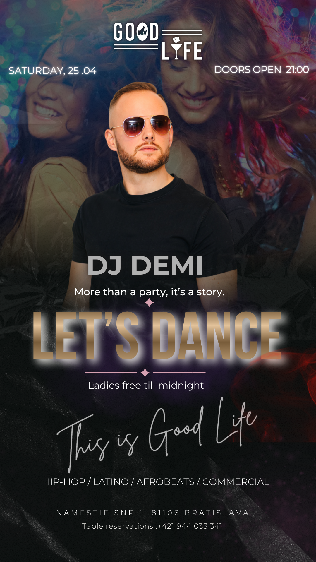 Zahoď stres, obuj topánky a poď tancovať ako keby ťa nik nevidel! DJ Demi ti namieša hudobný koktail latina, hip hopu či afrobeats.