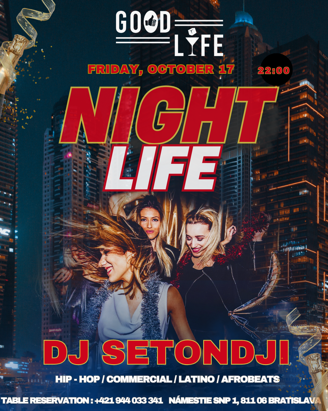 Bratislavská noc ožíva a Good Life Club sa mení na epicentrum mestského života. DJ Setondji ťa prevedie beatmi cez veľkomestá - od latino klubov až po komerčné párty v štýle NYC. Príď sa nechať uniesť hudbou a atmosférou, ktorú inde nezažiješ.