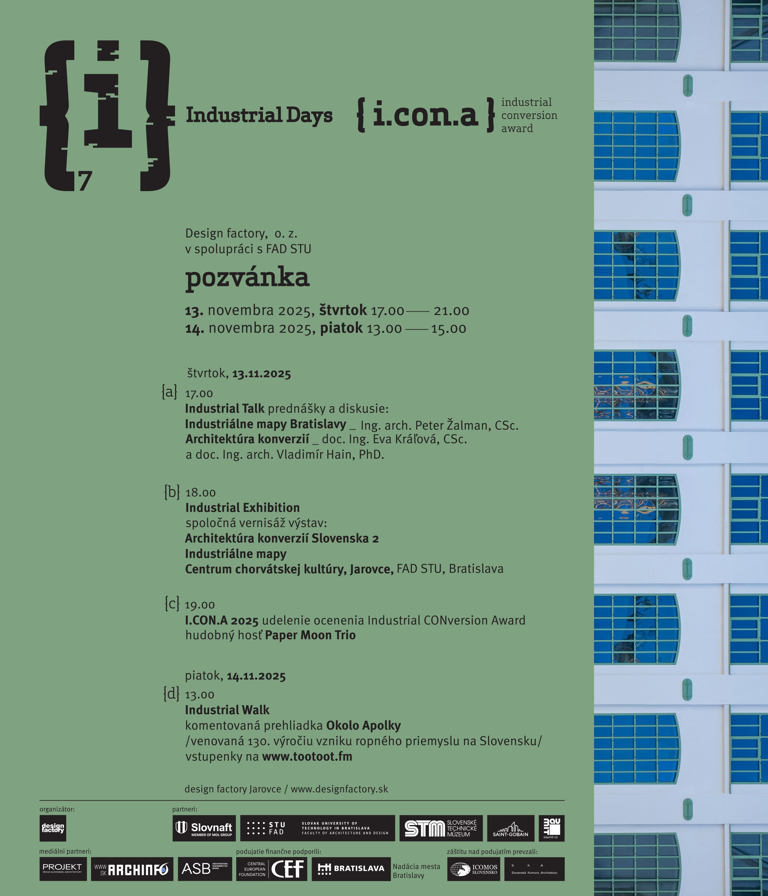 Súčasťou Industrial Days bude aj autorská výstava Architektúra konverzií Slovenska 2, ktorá vzniká v produkcii Design factory pod kurátorským vedením doc. Ing. Evy Kráľovej, CSc., Ing. arch. Evy Bellákovej, PhD. a doc. Ing. arch. Vladimíra Haina, PhD. z FAD STU a ponúka pohľad autorov na túto problematiku a formy jej prezentácie pre širokú verejnosť. Vernisáž výstavy sa uskutoční v rámci siedmeho vydania festivalu Industrial Days v novembri 2025 v priestoroch kultúrno-kreatívneho centra Design factory v Jarovciach. Výstava zároveň predstaví najinšpiratívnejšie projekty, z ktorých vyberie medzinárodná porota víťaza ceny I.CON.A – Industrial Conversion Award 2025.