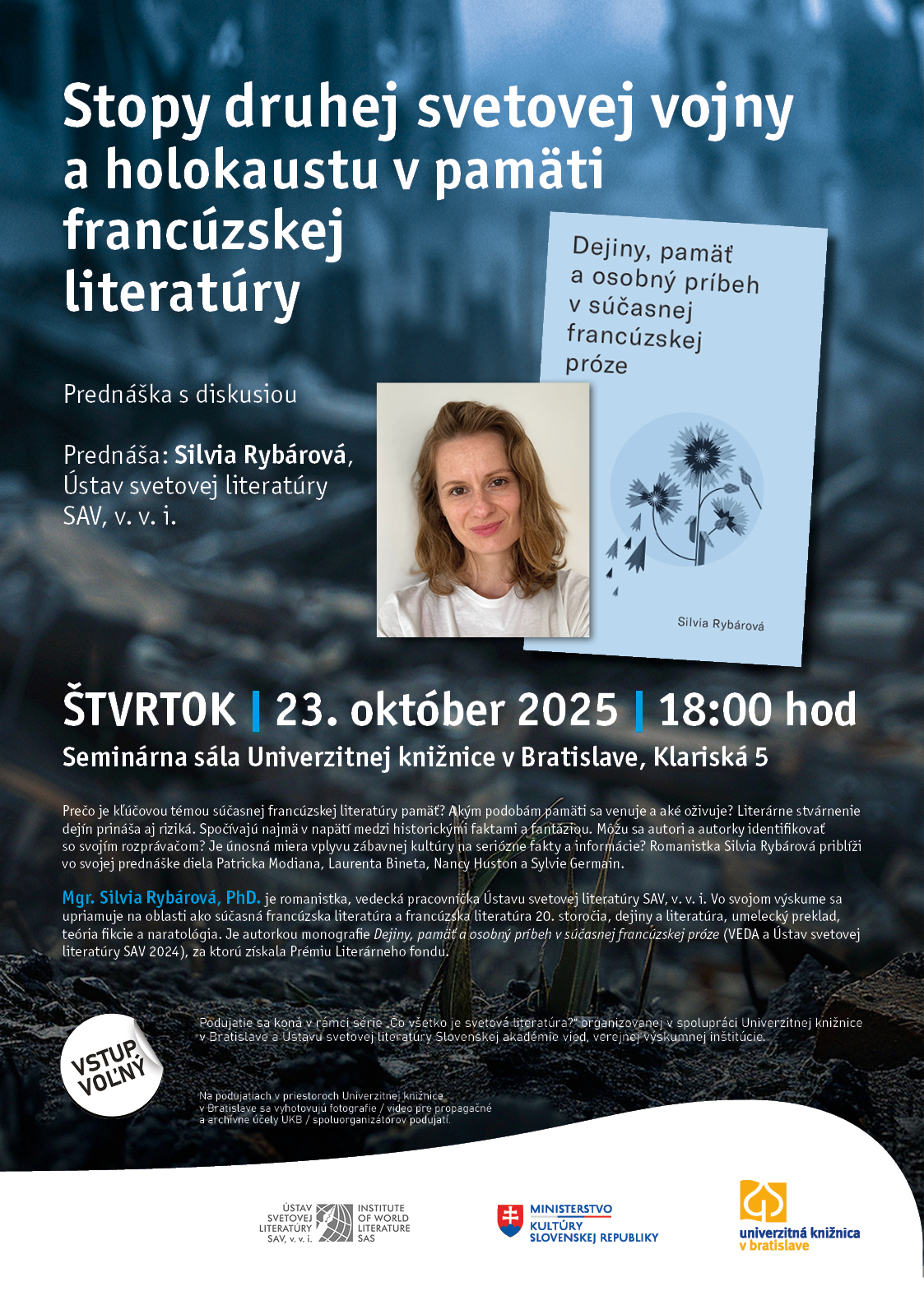 Prednáša: Mgr. Silvia Rybárová, PhD., romanistka, vedecká pracovníčka Ústavu svetovej literatúry SAV, v. v. i. Vo svojom výskume sa upriamuje na oblasti ako súčasná francúzska literatúra a francúzska literatúra 20. storočia, dejiny a literatúra, umelecký preklad, teória fikcie a naratológia. Je autorkou monografie Dejiny, pamäť a osobný príbeh v súčasnej francúzskej próze (VEDA a Ústav svetovej literatúry SAV 2024), za ktorú získala Prémiu Literárneho fondu.
