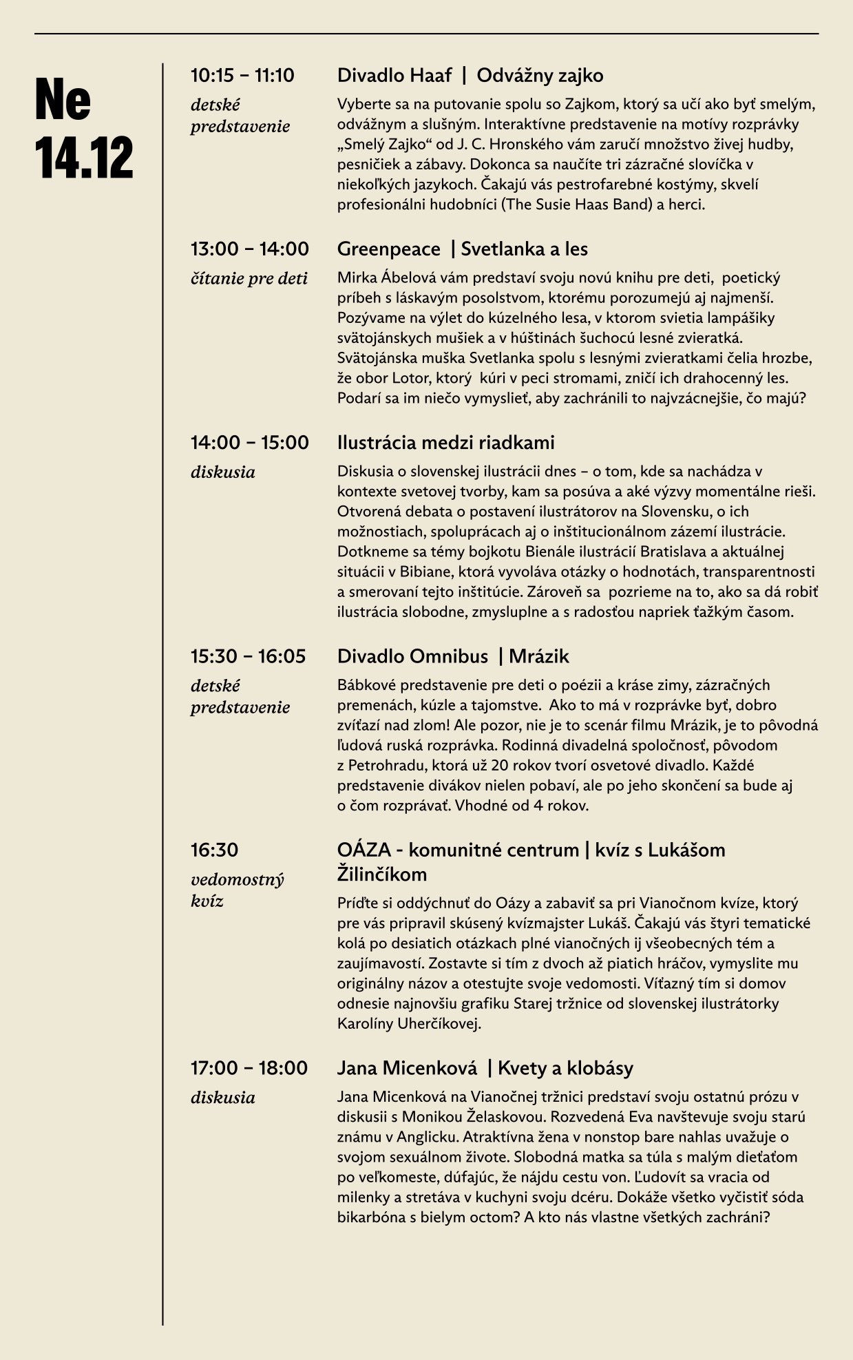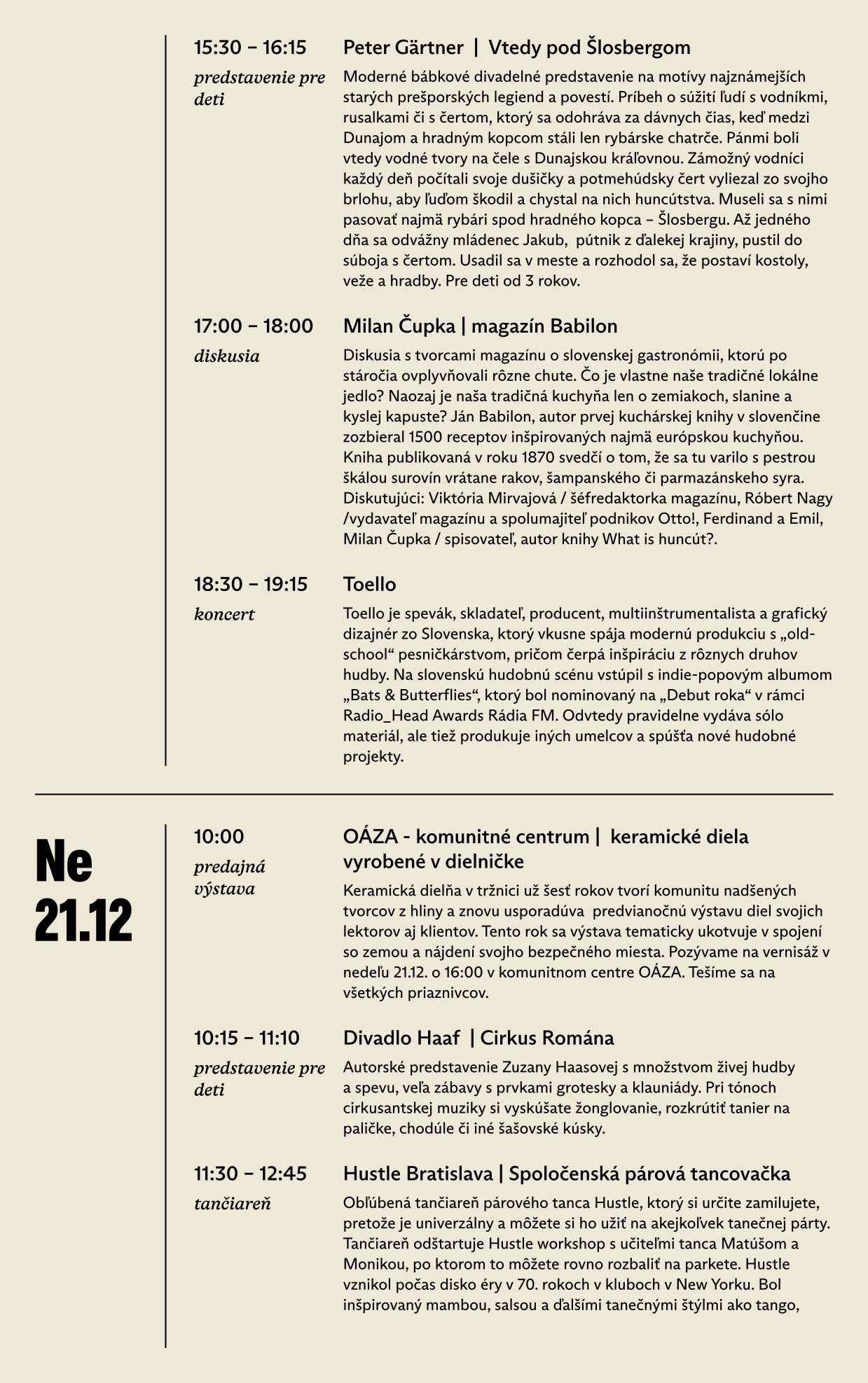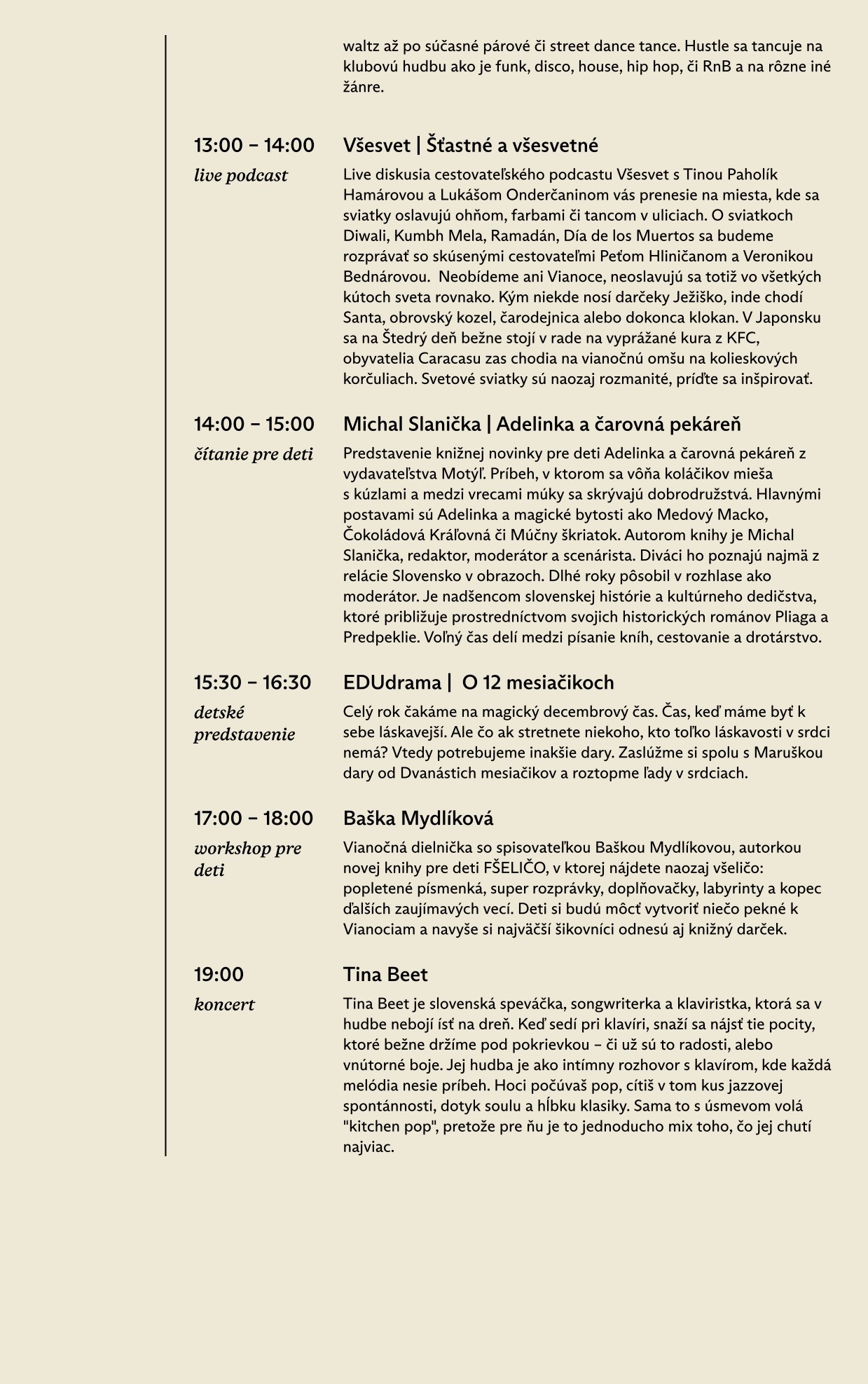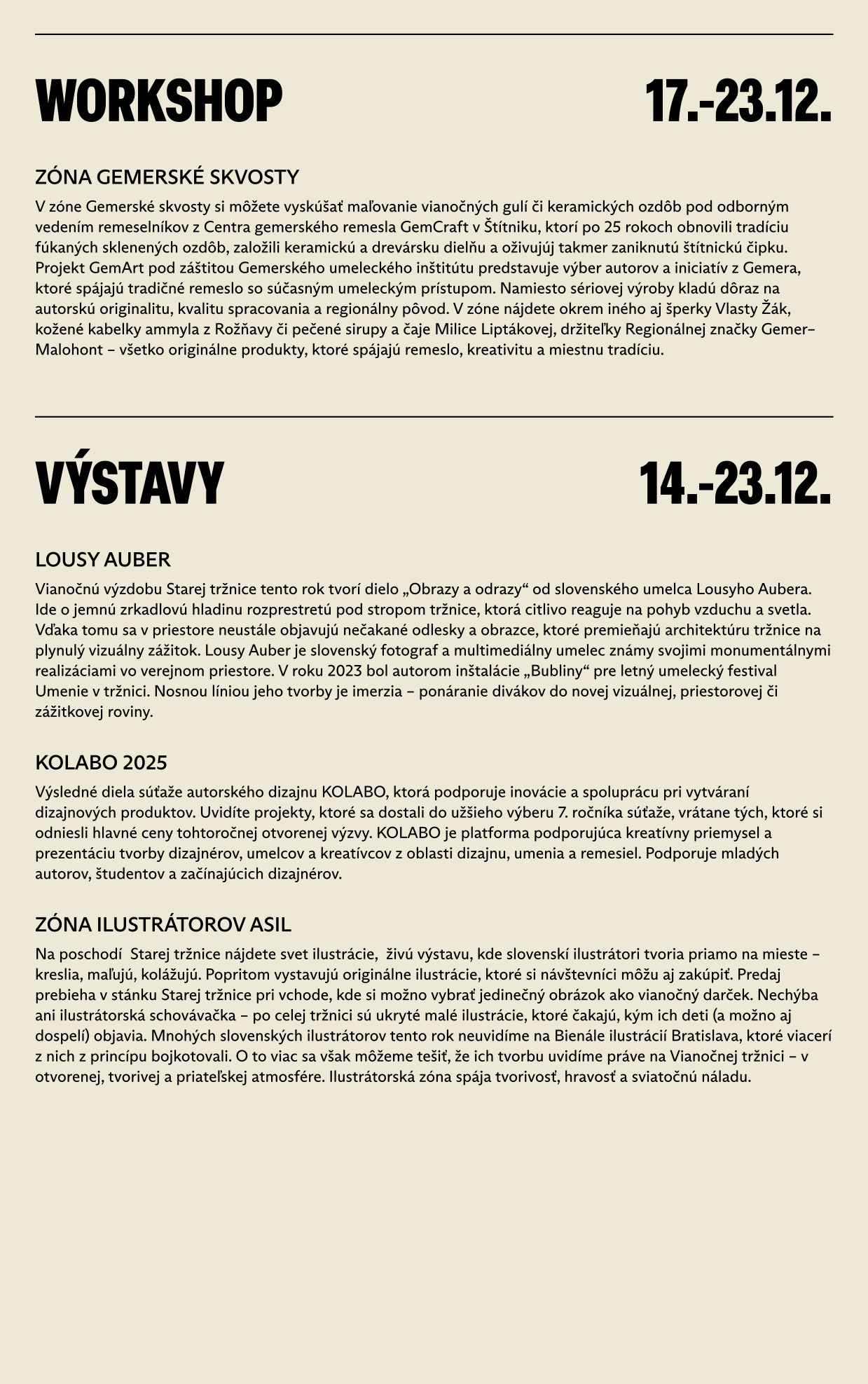 Pod jednou strechou nájdete kurátorovaný výber lokálnych značiek, dizajnérov, autorov, vydavateľstiev, remeselných výrobcov potravín a umelcov. Je to ideálna príležitosť nájsť originálne darčeky pre svojich blízkych a zároveň podporiť kvalitnú domácu tvorbu.