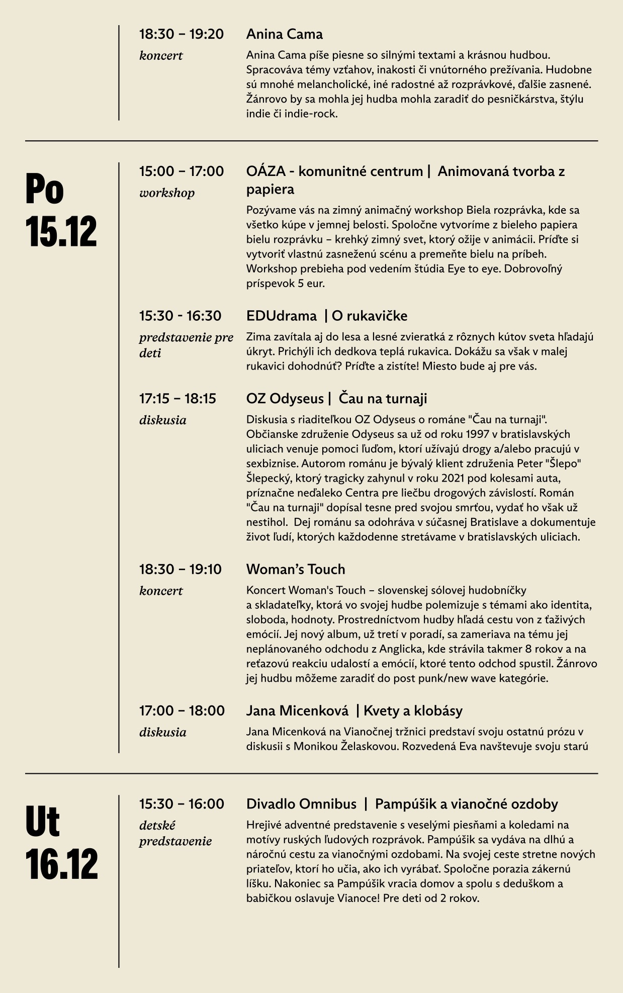 Okrem bohatého výberu predajcov sa môžete tešiť aj na kultúrny program, koncerty, tvorivé workshopy a aktivity pre deti. Príjemná vianočná atmosféra a komunitný charakter podujatia robia z Vianočnej tržnice miesto, kde sa stretáva tradícia, kreativita a podpora lokálnych tvorcov.