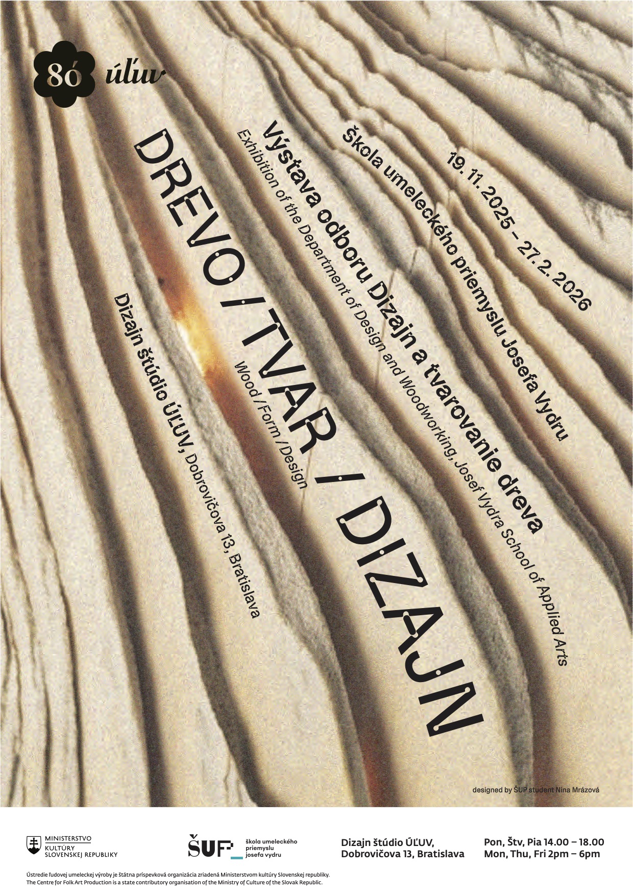 Dizajn štúdio ÚĽUV pravidelne ponúka priestor na prezentáciu stredným školám z rôznych odvetví dizajnu, ktoré vychádzajú z výskumu remeselnej tradície i klasických technológií, využívajú prírodné suroviny a tradičné materiály alebo inovatívne postupy. Aktuálna výstava prezentuje výber žiackych prác bratislavskej Školy umeleckého priemyslu Josefa Vydru za ostatných 25 rokov, odkedy nesie názov Dizajn a tvarovanie dreva. Výber z tohto obdobia zastupuje široké spektrum tém a prístupov: prepájanie techník tradičného remesla a dizajnu, realizácie drobných úžitkových predmetov a šperkov, nábytku, svietidiel a hračiek, pričom poukazuje na kreativitu a remeselné zručnosti študentov. To všetko zhmotnené v materiáli, ktorý odkazuje na prírodné bohatstvo Slovenska – jeho materiálnu kultúru, tradíciu a nadčasovosť, ale aj potenciál využitia v súčasnom dizajne.